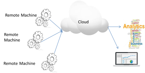 Core of this solution is M2M/IoT technologies. We connect wireless devices to your machine which capture the relevant parameters and communicate them to a cloud server over the wireless communication network. The raw packets of information captured from these machines are decoded and presented on an web application or mobile devices.